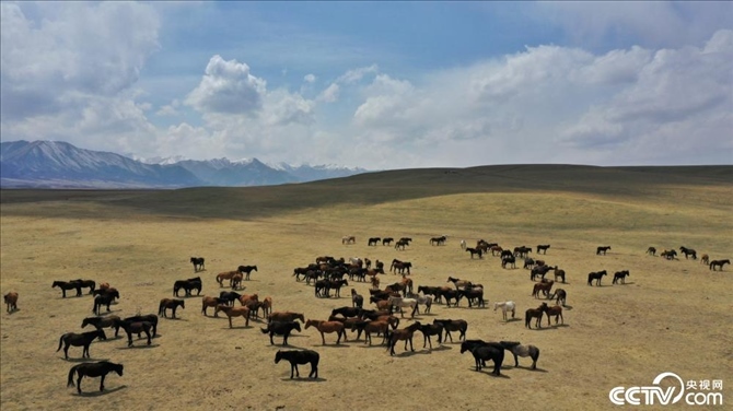 甘肅張掖,初夏時節(jié),位于祁連山下的山丹馬場積雪消融,草原開始泛綠,成群的馬匹正在吃草,一派生機勃勃的景象。