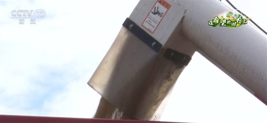總臺記者 趙雄:歡迎大家跟隨我們的鏡頭一起走進成都平原,來感受豐收的喜悅。我現(xiàn)在所在的位置是四川邛崍市的萬畝糧油示范基地。在我身后,200多畝成片的小麥已經(jīng)成熟,放眼望去,金黃的麥穗在風(fēng)中搖曳,麥浪翻滾煞是喜人。在麥田上,我們可以看到多臺大型收割機來回穿梭作業(yè),一簇簇麥穗被卷入收割機倉,收割、脫粒、除雜一氣呵成,金色麥粒傾瀉入倉。