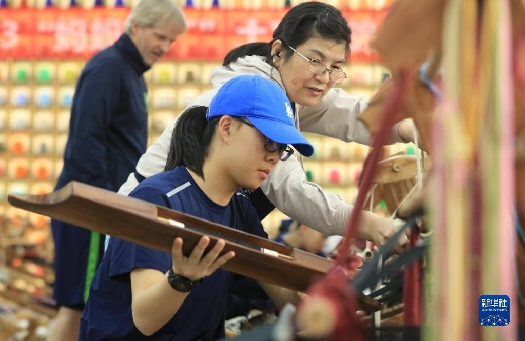 5月12日,來自上海包玉剛實驗學(xué)校的學(xué)生在張家界市武陵源區(qū)乖幺妹土家族織錦基地學(xué)習(xí)體驗土家族織錦非遺技藝。