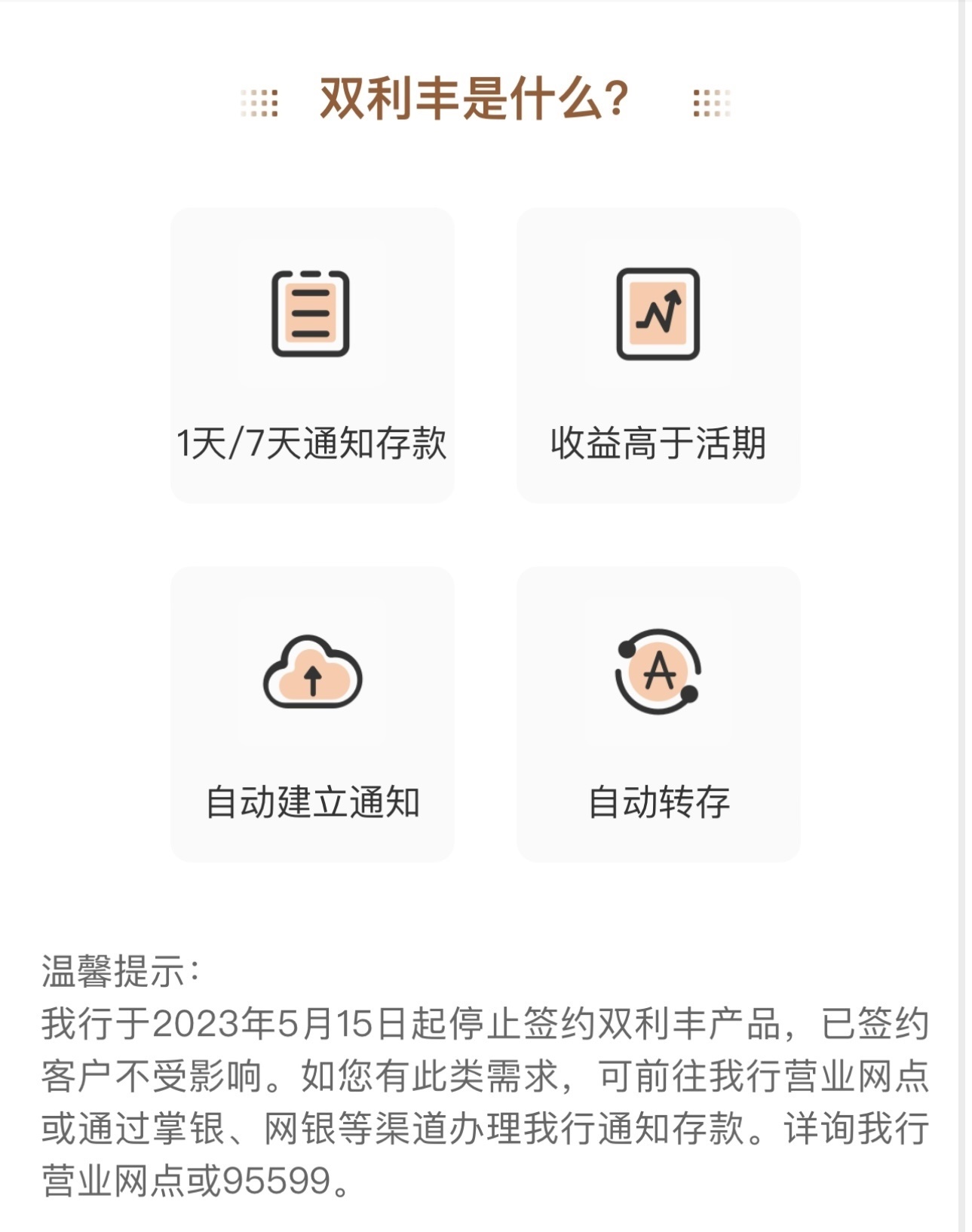 農(nóng)業(yè)銀行App顯示,該行存款專區(qū)中的智能通知存款產(chǎn)品“雙利豐”于5月15日起停止簽約,已簽約客戶不受影響。農(nóng)行表示,如有此類需求,可前往營業(yè)網(wǎng)點(diǎn)或通過掌銀、網(wǎng)銀等渠道辦理通知存款。