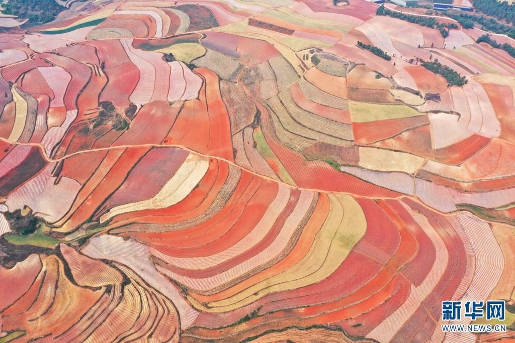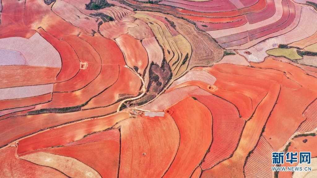 云南省尋甸回族彝族自治縣,連綿不斷的旱梯田遍布山間,遠(yuǎn)接天邊,每年4-5月,經(jīng)過(guò)村民翻新、平整后的紅褐色土地,從空中俯瞰五彩斑斕、蔚為壯觀。當(dāng)?shù)卮迕裥燎诟旁诜饰值募t土地上,用勤勞的雙手,繪就一幅幅勞動(dòng)藝術(shù)畫(huà)作。新華網(wǎng)發(fā)(孫文來(lái) 攝影報(bào)道)