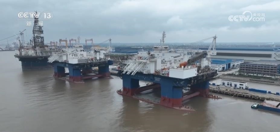 這些大家伙,都是世界技術(shù)比較領(lǐng)先的一些海工裝備。通過航拍的鏡頭,給大家展現(xiàn)一下,最遠(yuǎn)的是圓筒形超深水鉆探平臺。因?yàn)樗耐庑问仟?dú)特的圓筒型設(shè)計(jì),所以它的抗風(fēng)浪性、作業(yè)水深的能力非常得好,技術(shù)指標(biāo)創(chuàng)下多項(xiàng)世界第一。這家企業(yè),一共向國外交付了6艘同類型的產(chǎn)品。