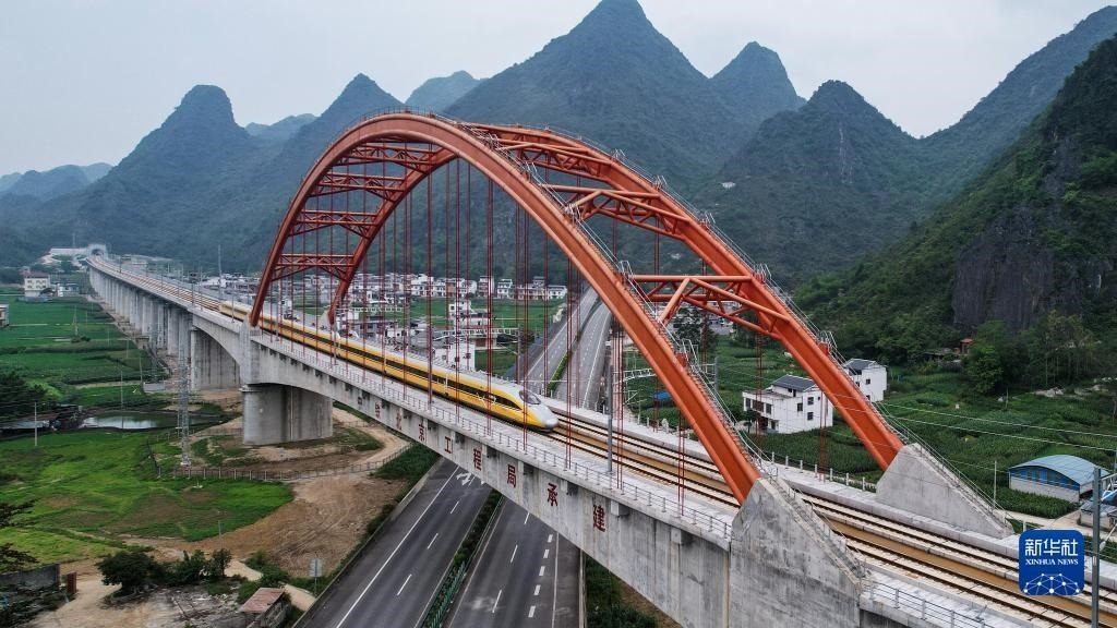 5月16日,高速綜合檢測(cè)列車行駛在貴南高鐵上進(jìn)行檢測(cè)工作(無(wú)人機(jī)照片)。