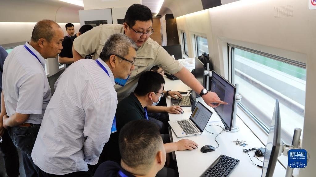 5月16日,在高速綜合檢測(cè)列車上,聯(lián)調(diào)聯(lián)試工作人員在分析測(cè)試數(shù)據(jù)。