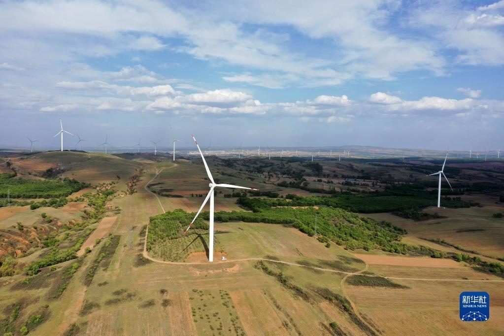 山西省右玉縣四臺溝村田園景色(5月18日攝,無人機照片)。