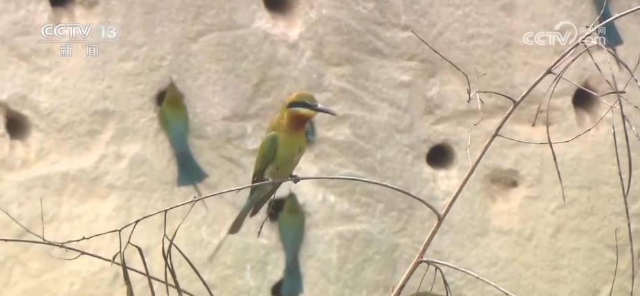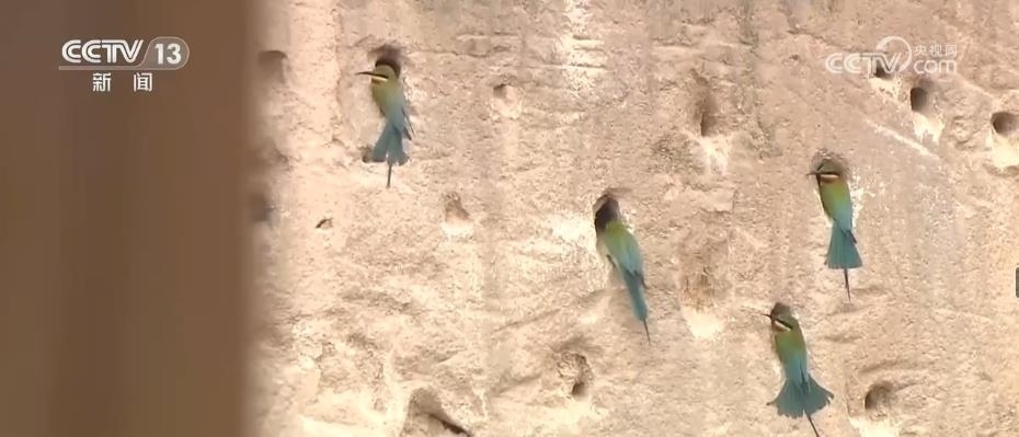 眼前,這些看上去很像是泥巴墻的建筑,其實(shí)是人工建造的候鳥巢穴。根據(jù)栗喉蜂虎的生活習(xí)慣,保護(hù)區(qū)工作人員專門在它們回來之前就對(duì)懸壁進(jìn)行修整,讓這些美麗的小鳥更方便安家。