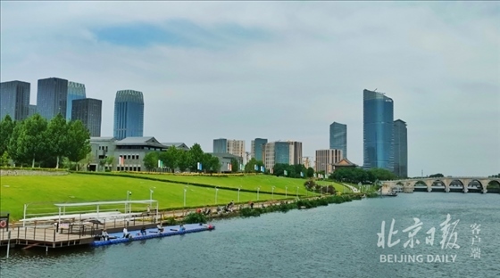 今天,古塔腳下,新城崛起。登臨五河交匯處的高樓觀景平臺,憑欄眺望,只見運(yùn)河水道兩側(cè),現(xiàn)代化樓宇鱗次櫛比。這里是城市副中心運(yùn)河商務(wù)區(qū)所在地,20679家注冊企業(yè)入駐、包括國家級綠色交易所在內(nèi)的一批重大項(xiàng)目相繼落戶,為其注入勃發(fā)生機(jī)。