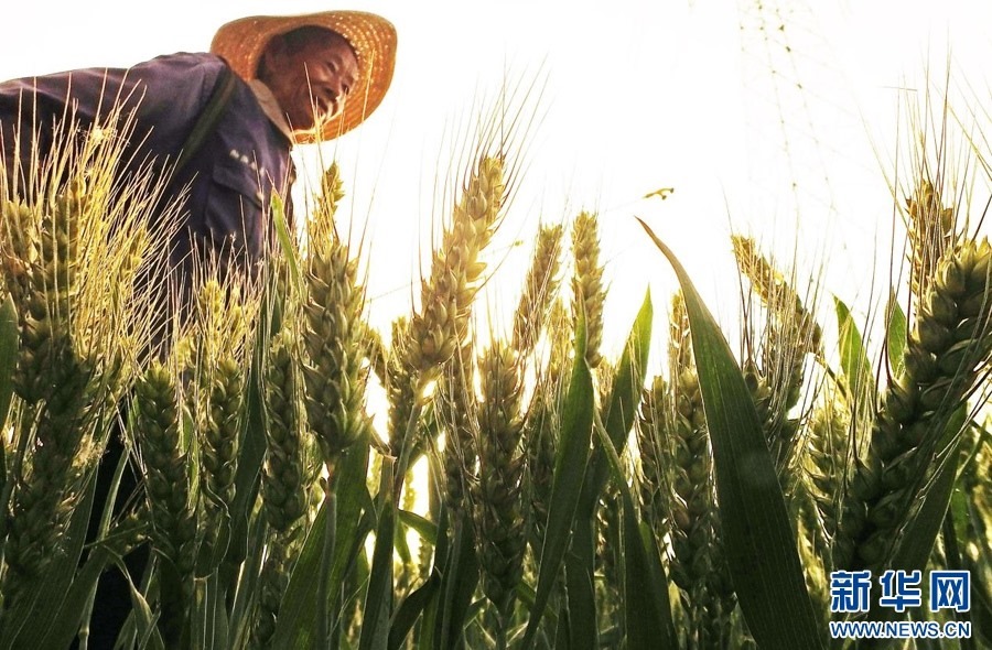 ??夕陽下,麥農(nóng)察看小麥長勢。新華網(wǎng) 發(fā)(高新生 攝)??