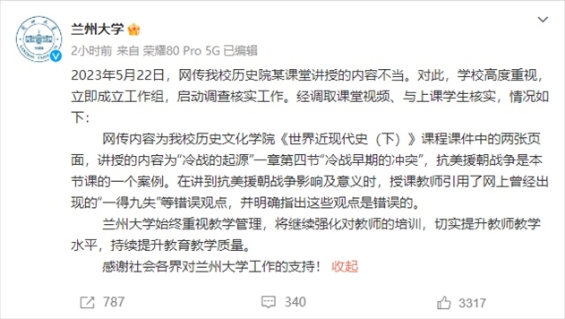 ·蘭州大學回應教師課堂上“歪曲歷史”:教師引用網上曾經出現的錯誤觀點,并指出這些觀點是錯誤的。