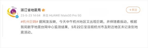 ·杭州地區(qū)出現巨響?浙江省地震局:未記錄到地震活動。