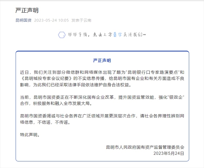 ·昆明市國資委發(fā)布聲明,“昆明銀行口專家路演要點(diǎn)”和《昆明城投專家會議紀(jì)要》不實。
