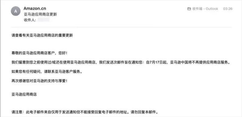 ·亞馬遜應(yīng)用商店發(fā)送郵件提醒稱,自7月17日起亞馬遜中國將不再提供應(yīng)用商店服務(wù)。
