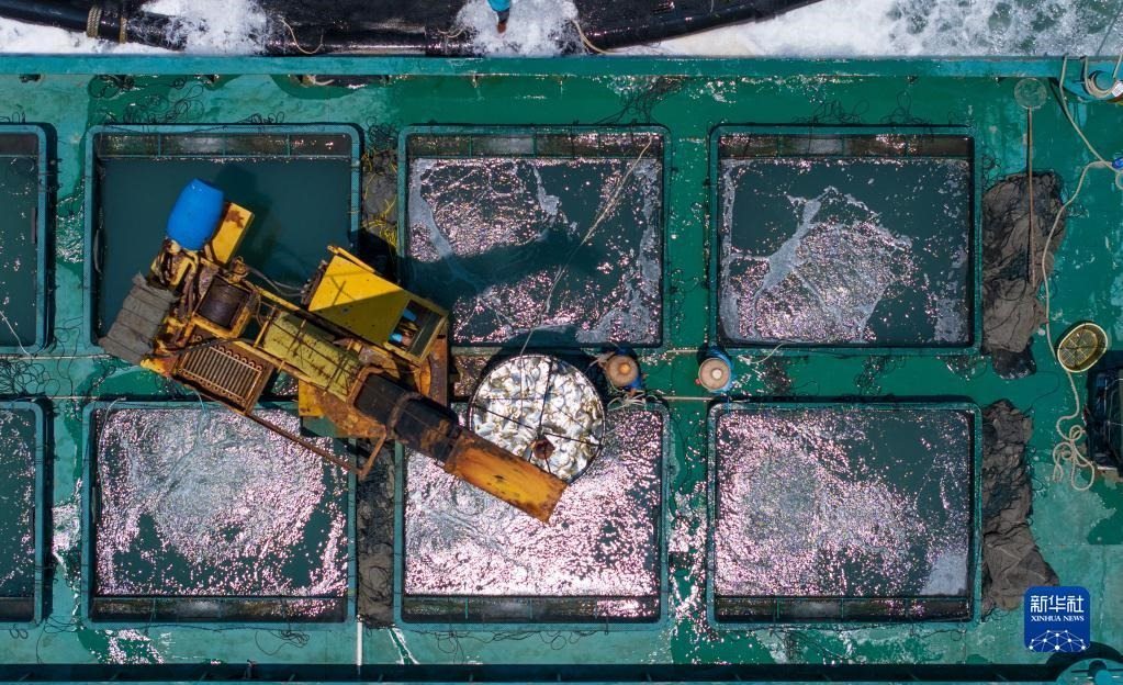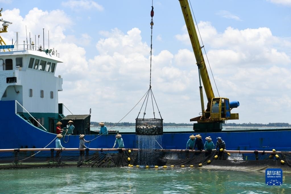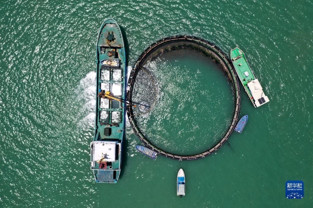 5月27日,在湛江市徐聞縣西連鎮(zhèn),漁業(yè)工人從徐聞國(guó)橋深海養(yǎng)殖有限公司的金鯧魚(yú)深海網(wǎng)箱捕魚(yú)(無(wú)人機(jī)照片)。
