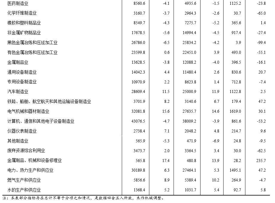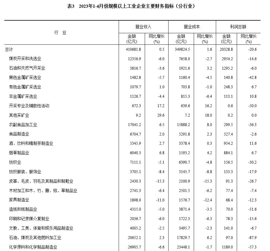 1—4月份,在41個工業(yè)大類行業(yè)中,13個行業(yè)利潤總額同比增長,1個行業(yè)持平,27個行業(yè)下降。主要行業(yè)利潤情況如下:電力、熱力生產(chǎn)和供應(yīng)業(yè)利潤總額同比增長47.2%,電氣機(jī)械和器材制造業(yè)增長30.1%,通用設(shè)備制造業(yè)增長20.7%,汽車制造業(yè)增長2.5%,石油和天然氣開采業(yè)下降6.0%,專用設(shè)備制造業(yè)下降7.4%,煤炭開采和洗選業(yè)下降14.6%,非金屬礦物制品業(yè)下降27.4%,紡織業(yè)下降30.2%,農(nóng)副食品加工業(yè)下降36.3%,計算機(jī)、通信和其他電子設(shè)備制造業(yè)下降53.2%,有色金屬冶煉和壓延加工業(yè)下降55.1%,化學(xué)原料和化學(xué)制品制造業(yè)下降57.3%,石油、煤炭及其他燃料加工業(yè)下降87.9%,黑色金屬冶煉和壓延加工業(yè)下降99.4%。