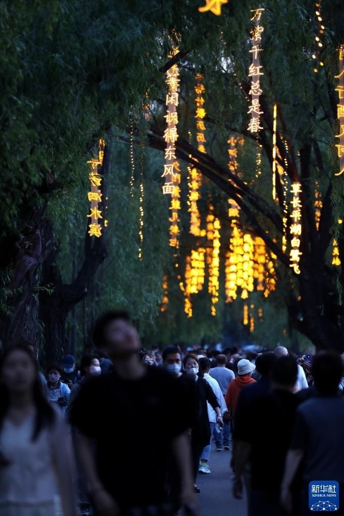 近日,沈陽(yáng)市萬(wàn)泉公園打造的一條詩(shī)詞漫道成為游客和市民的網(wǎng)紅打卡地。每當(dāng)夜幕降臨,幾十首古詩(shī)詞彩燈在這條300余米道路的樹梢枝頭熠熠閃爍,以詩(shī)入景,一步一詩(shī)。新華社記者 姚劍鋒 攝