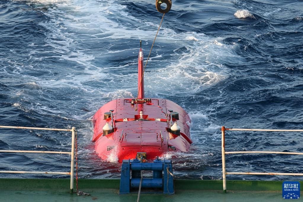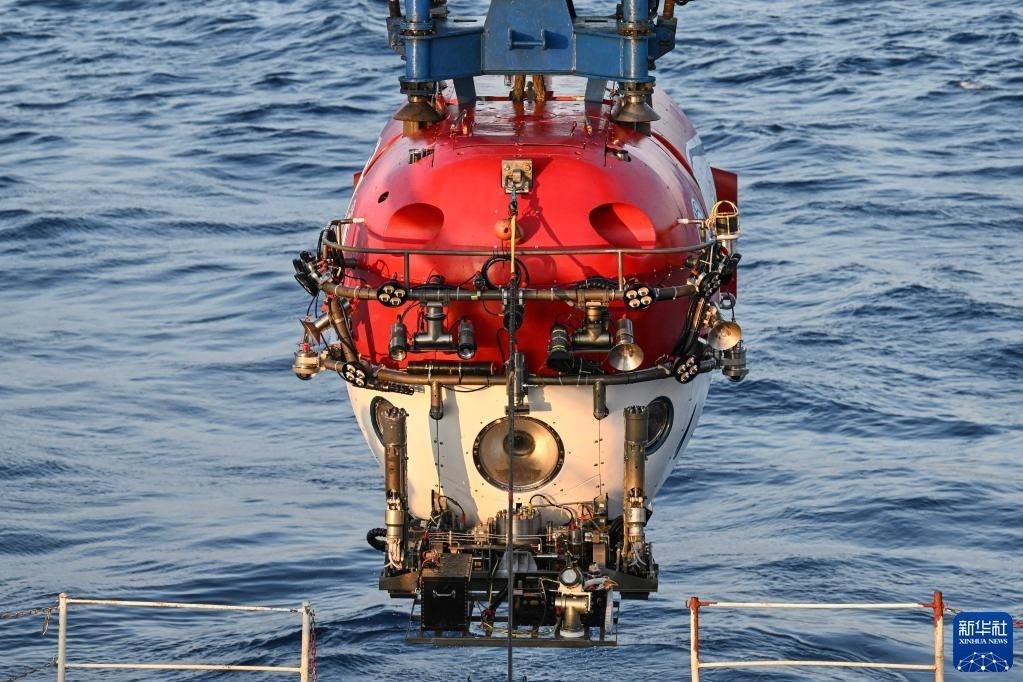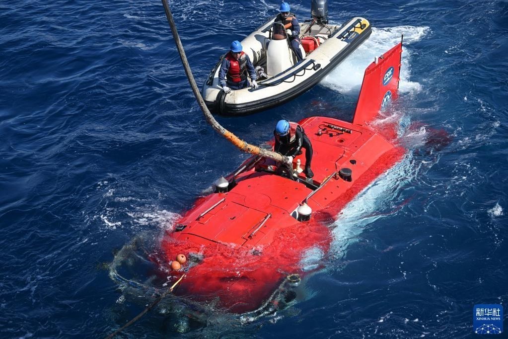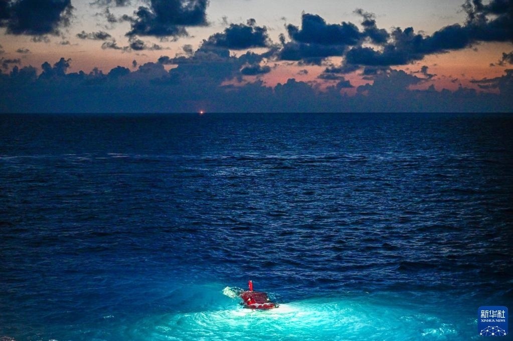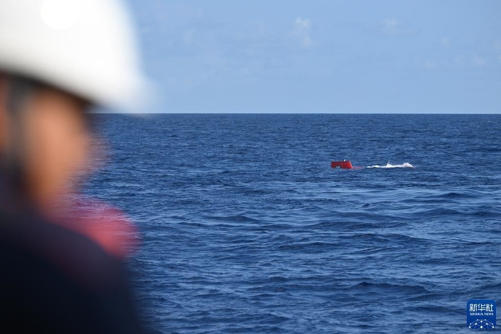 在結(jié)束當(dāng)日的水下調(diào)查后,搭載著考古隊員的“深海勇士”號載人潛水器浮出海面(5月27日攝)。   新華社記者 蒲曉旭 攝