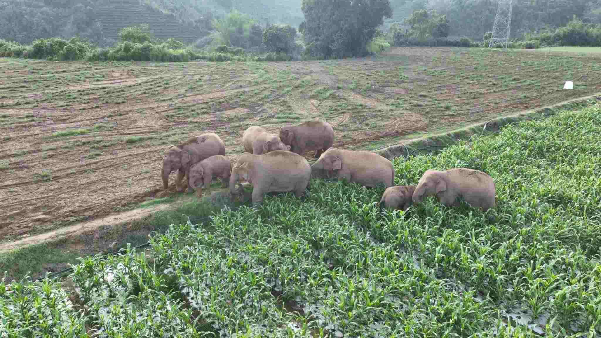 云南普洱:亞洲象群出山覓食戲水
