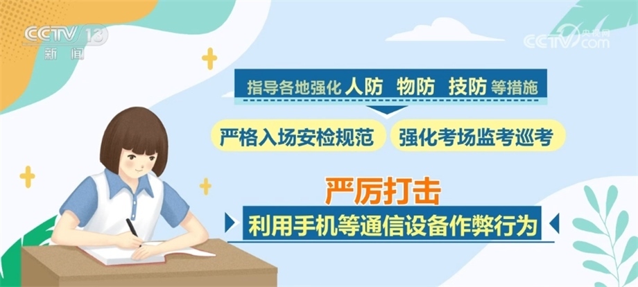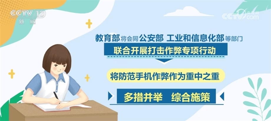 同時,會同公安部、工業(yè)和信息化部等部門聯(lián)合開展打擊作弊專項(xiàng)行動,將防范手機(jī)作弊作為重中之重,多措并舉、綜合施策,指導(dǎo)各地強(qiáng)化人防、物防、技防等措施,嚴(yán)格入場安檢規(guī)范,強(qiáng)化考場監(jiān)考巡考,嚴(yán)厲打擊利用手機(jī)等通信設(shè)備作弊行為。對于在高考中存在作弊行為的考生和人員,將依法依規(guī)嚴(yán)肅處理,堅(jiān)決維護(hù)高考的公平公正。