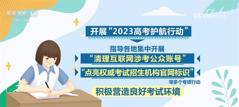 此外,將繼續(xù)開展“2023高考護(hù)航行動”,指導(dǎo)各地集中開展“清理互聯(lián)網(wǎng)涉考公眾賬號”“點(diǎn)亮權(quán)威考試招生機(jī)構(gòu)官網(wǎng)標(biāo)識”等多個專項(xiàng)行動,積極營造良好考試環(huán)境。