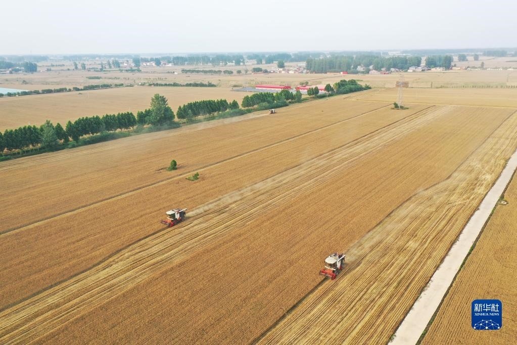 6月1日,在河南省駐馬店市上蔡縣邵店鎮(zhèn)后楊村,收割機(jī)在搶收小麥(無人機(jī)照片)。新華社記者 張浩然 攝