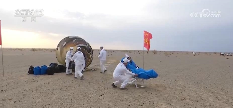 返回艙艙門打開后,醫(yī)監(jiān)醫(yī)保人員確認(rèn)航天員身體健康。