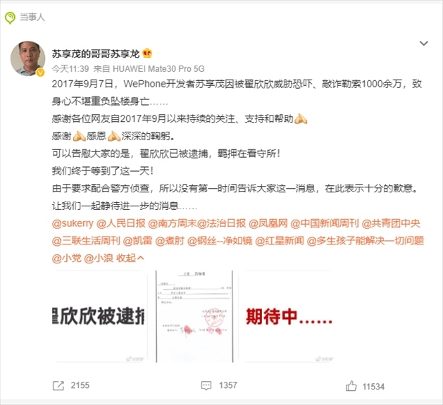 ·索要千萬(wàn)逼死丈夫?WePhone開(kāi)發(fā)者蘇享茂家屬:翟欣欣涉嫌敲詐勒索已被逮捕。