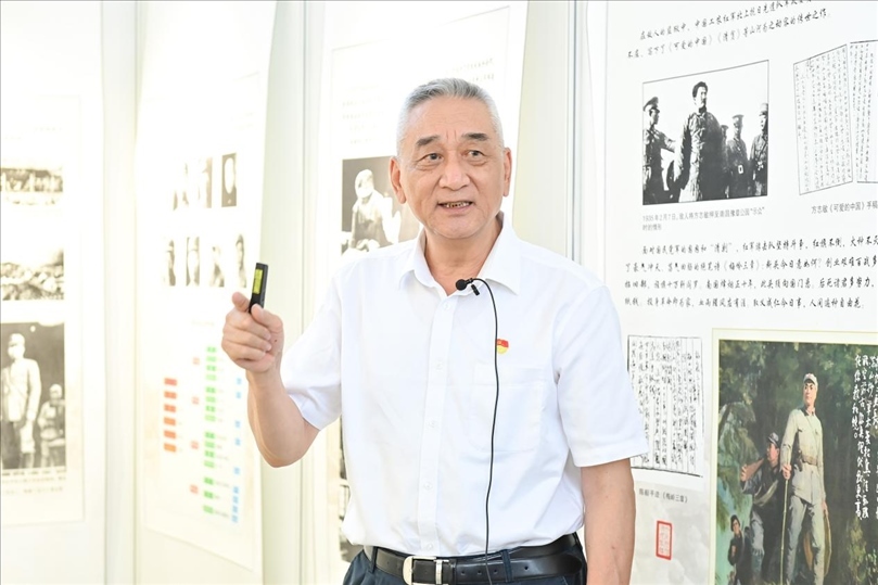 會(huì)后,領(lǐng)導(dǎo)嘉賓觀(guān)看“背負(fù)民族希望—紀(jì)念新四軍成立86周年回顧展”,張曉龍現(xiàn)場(chǎng)給大家講述新四軍的歷史沿革和征戰(zhàn)歷程。