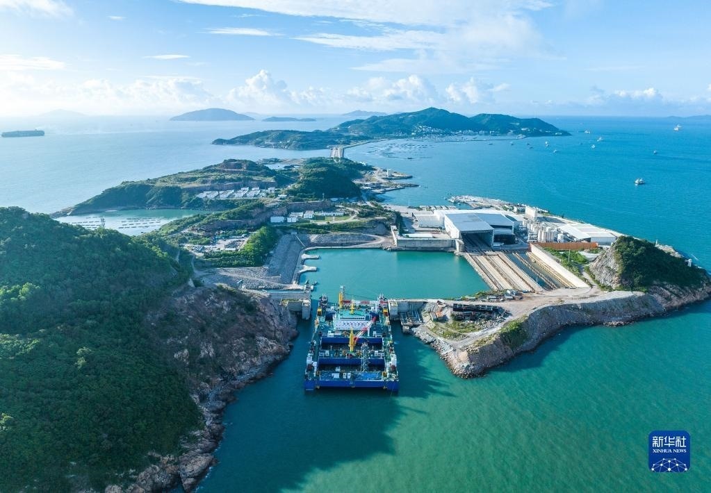 “一航津安1”號沉管運輸安裝一體船拖帶E23管節(jié)和最終接頭從珠海桂山島啟航,前往沉放水域(6月8日攝,無人機照片)。