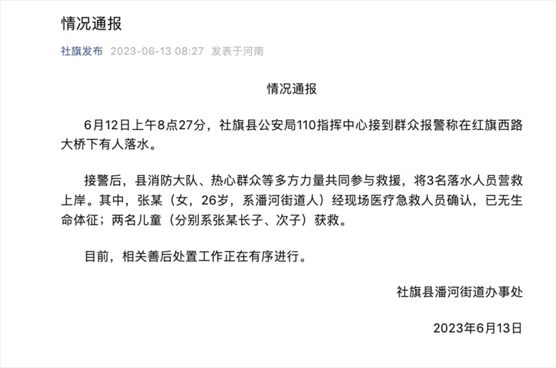 ·網傳南陽26歲媽媽帶2幼兒跳河,官方通報:女子已離世,兩名兒童獲救。
