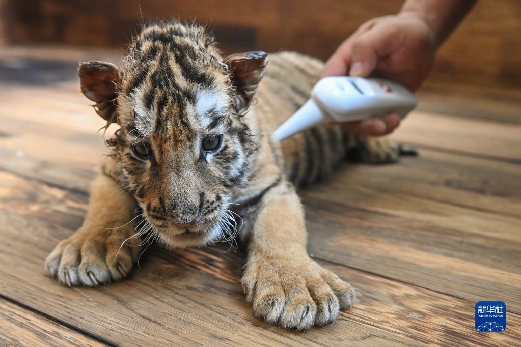 6月13日,在黑龍江東北虎林園的虎舍中,飼養(yǎng)員給東北虎幼崽測(cè)量體溫。