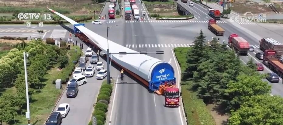 央視網(wǎng)消息:今天(6月14日)上午,100%我國(guó)自主知識(shí)產(chǎn)權(quán)的123米超長(zhǎng)海上風(fēng)電葉片在江蘇連云港啟動(dòng)陸地轉(zhuǎn)運(yùn)工作。上午9時(shí),代表著我國(guó)風(fēng)電裝備最新技術(shù)水準(zhǔn)的大葉片,從廠(chǎng)區(qū)到港口碼頭,陸地運(yùn)輸全程約30公里,耗時(shí)約3到4個(gè)小時(shí),其中運(yùn)輸大葉片的車(chē)輛還要拐過(guò)90度的直角彎。如此大體量的裝備運(yùn)輸是一個(gè)復(fù)雜的過(guò)程,其中有哪些技術(shù)難點(diǎn)?來(lái)看記者今天上午從現(xiàn)場(chǎng)發(fā)回的報(bào)道。