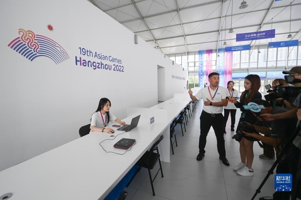 6月16日,工作人員在杭州亞運村歡迎中心介紹服務流程。歡迎中心包含代表團歡迎中心、媒體中心和訪客中心三個部分,其中代表團歡迎中心是所有代表團抵達亞運村的第一站,將提供24小時全天候服務。