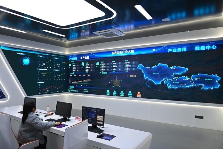 浙江安吉白茶“產(chǎn)業(yè)大腦”顯示黃杜村捐贈(zèng)種植在貴州、湖南、四川等3省5縣茶苗的分布情況(2023年2月21日攝)。新華社記者 黃宗治 攝