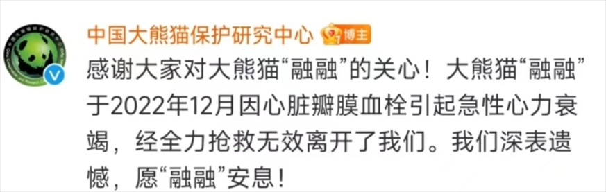 大熊貓“融融”于2022年12月因心臟瓣膜血栓引起急性心力衰竭,經(jīng)全力搶救無效離開了我們。我們深表遺憾,愿“融融”安息!