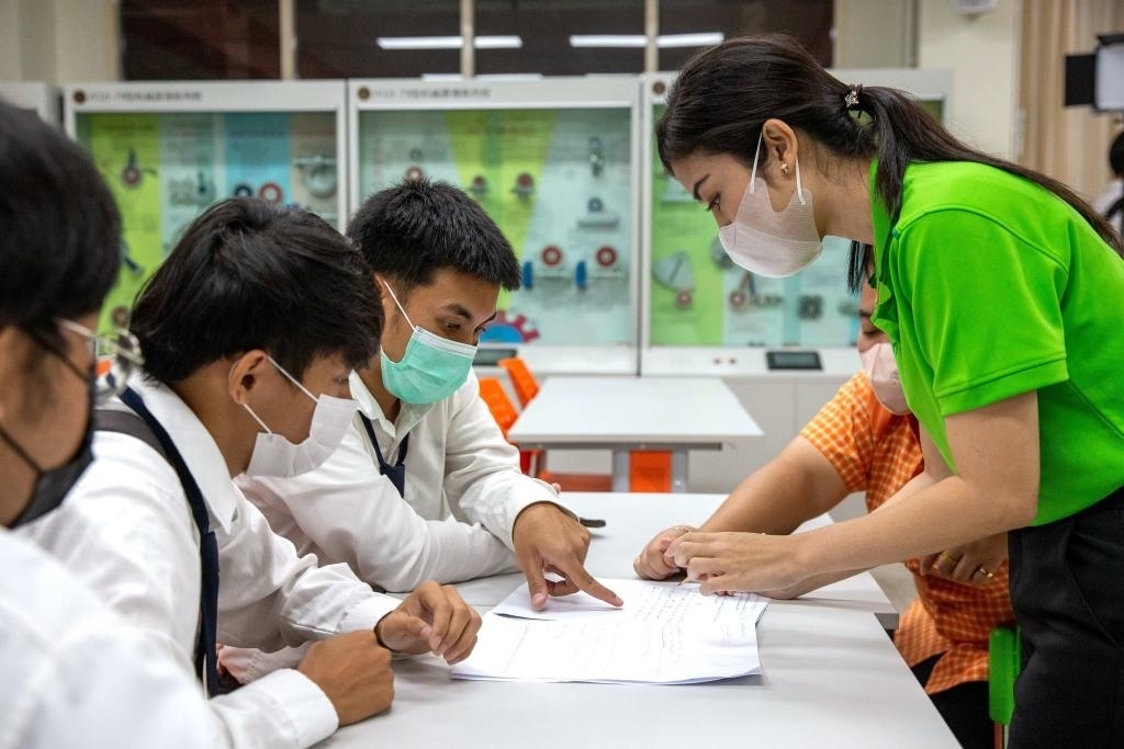 3月14日,在泰國大城府大城技術學院魯班工坊,教師(右一)給學生上課。新華社記者 王騰 攝