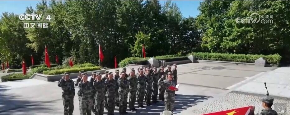 在黑龍江省虎林市第二次世界大戰(zhàn)終結(jié)地紀(jì)念園,入伍新兵面向軍旗、高舉右拳,向軍旗宣誓,以此向英雄致敬。在紀(jì)念碑前,全體人員整齊列隊,肅立脫帽,向逝者默哀,并敬獻(xiàn)花籃。