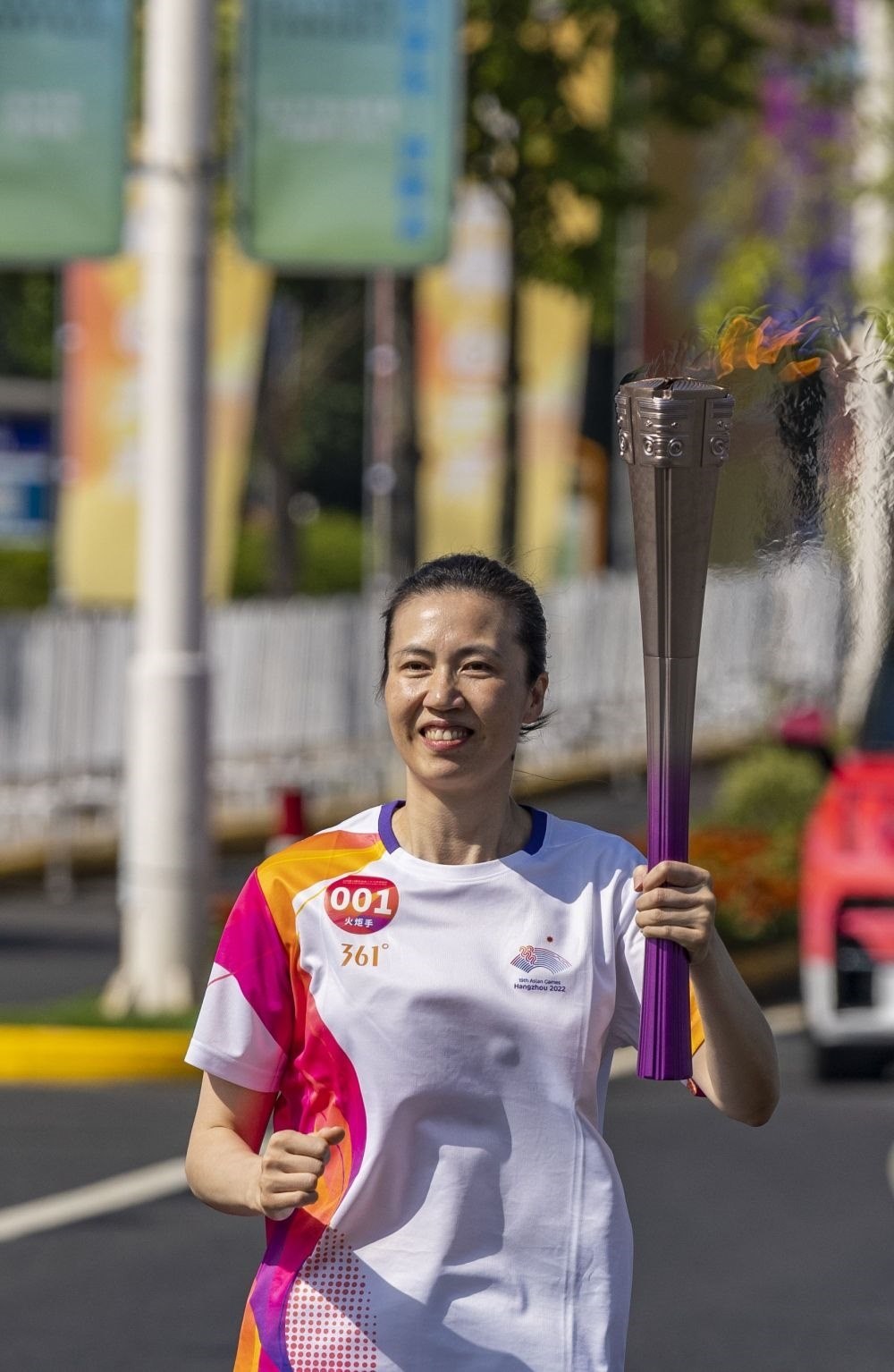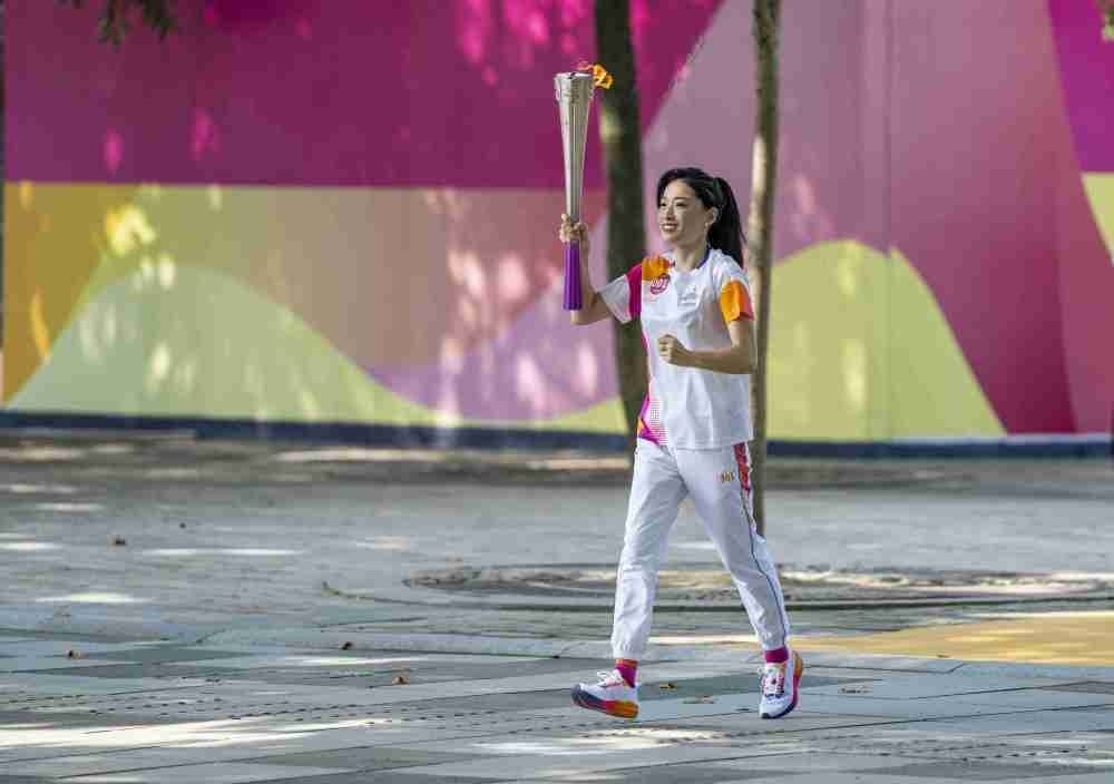 ↑火炬手方愉婷在火炬?zhèn)鬟f中。