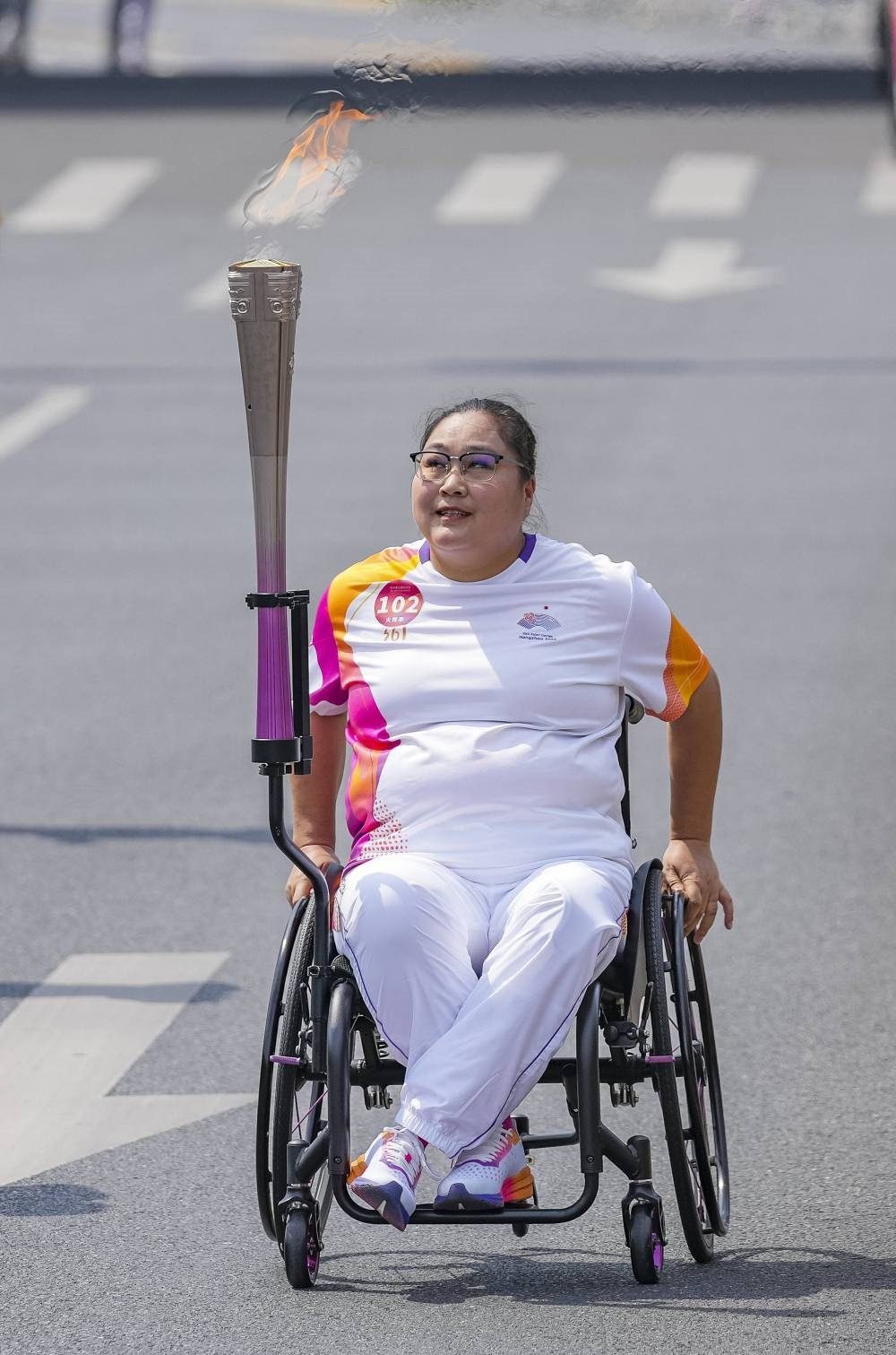 ↑火炬手程穎在火炬?zhèn)鬟f中。