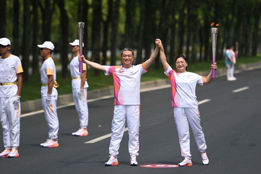 ↑火炬手鄭方(右)和施金仙在火炬?zhèn)鬟f中。