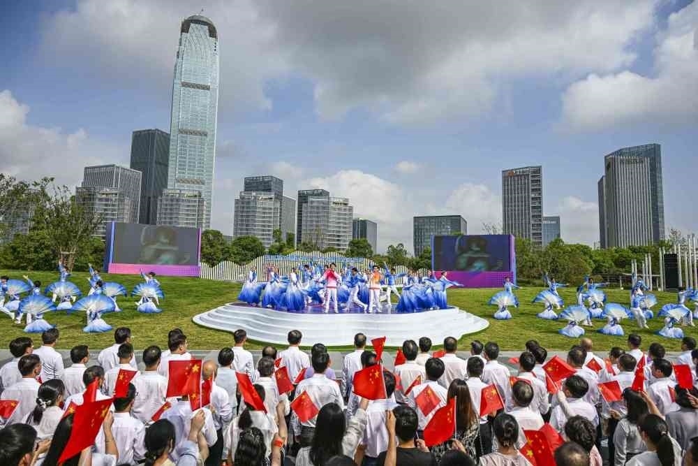 ↑這是杭州亞運(yùn)會(huì)火炬?zhèn)鬟f杭州站起跑儀式現(xiàn)場(chǎng)。