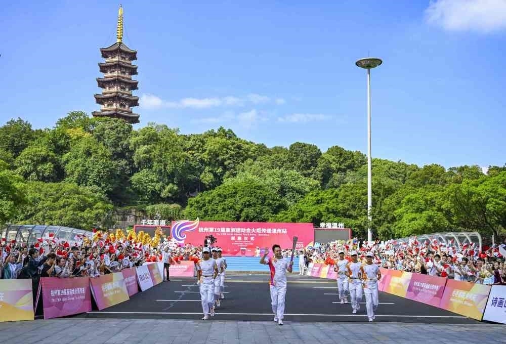 ↑這是杭州亞運(yùn)會(huì)火炬?zhèn)鬟f溫州站收火儀式現(xiàn)場(chǎng)。