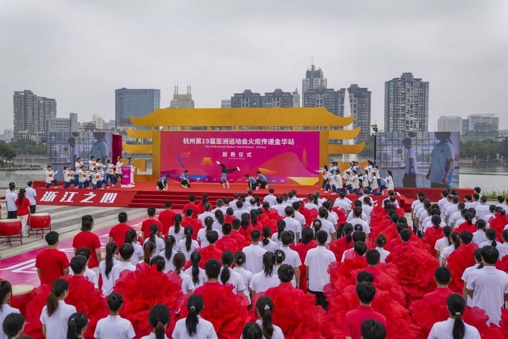 ↑這是杭州亞運(yùn)會(huì)火炬?zhèn)鬟f金華站起跑儀式現(xiàn)場(chǎng)。