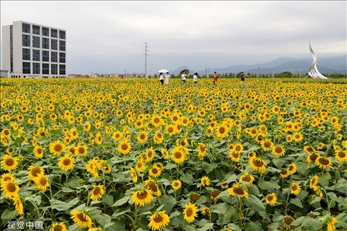 浙江金華,金東區(qū)東二環(huán)往金義快速路的東南側(cè),一大片向日葵迎來(lái)了盛開(kāi)季。