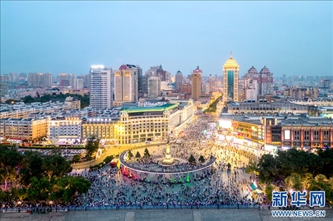 在哈爾濱市中央大街上,人們參加巡游慶?;顒印?/p>