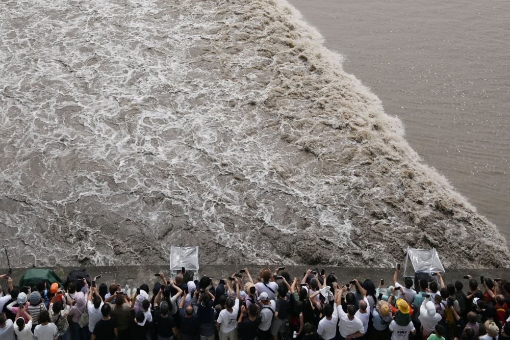 這是中秋當日游客們在觀看錢塘江潮