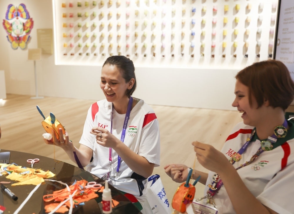 9月25日,一名日本運動員(右)在淳安賽區(qū)傳統(tǒng)工藝體驗坊和志愿者合影。
