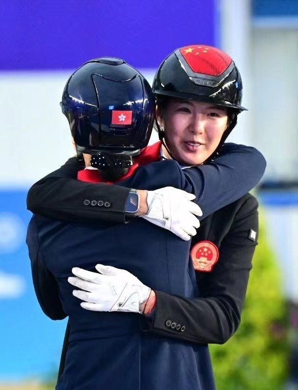 在桐廬馬術(shù)中心進行的杭州亞運會馬術(shù)比賽盛裝舞步團體賽頒獎儀式上,獲得亞軍的中國隊隊員饒嘉怡(右)與獲得季軍的中國香港隊隊員蕭穎瑩相互擁抱祝福(9月26日攝)