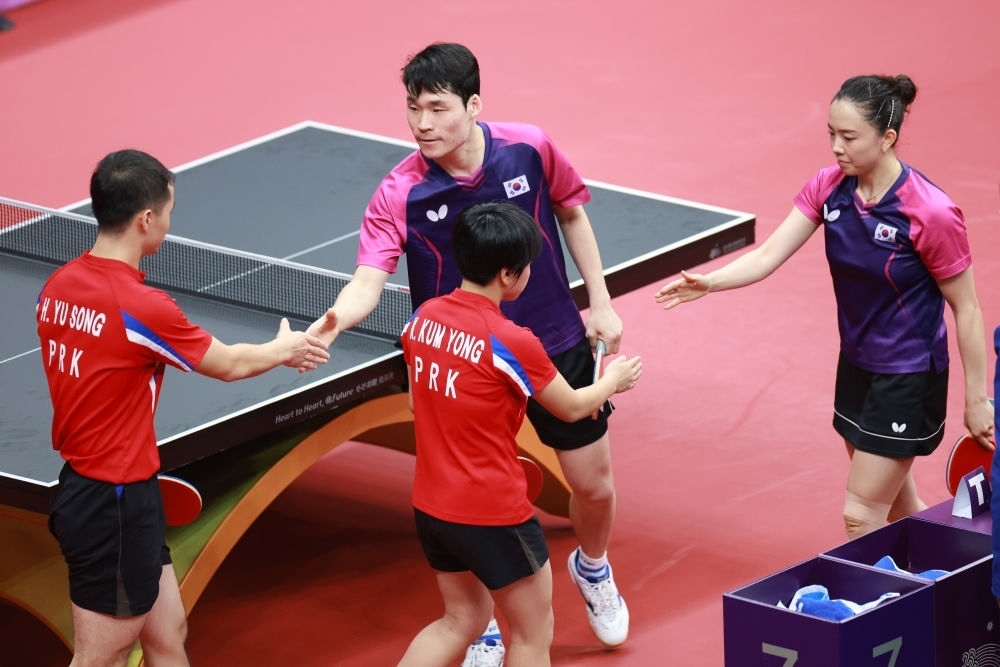 9月28日,韓國組合張禹珍/田志希與朝鮮組合咸柔成/金金鷹在乒乓球混合雙打八分之一決賽后握手致意。