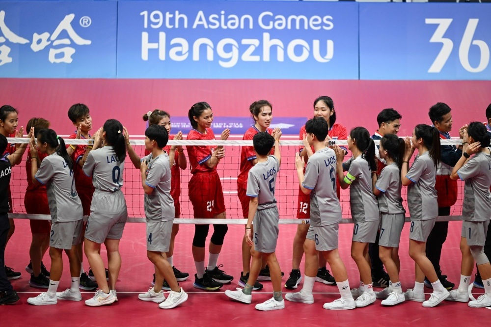 9月28日,泰國隊和老撾隊(前)在藤球女子單組團體半決賽后互相致意。