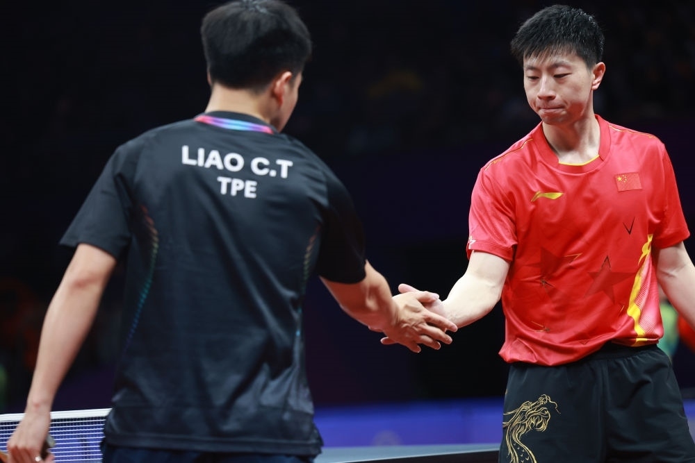 9月25日,中國隊選手馬龍(右)在乒乓球男子團體半決賽后與中國臺北隊選手廖振珽握手致意。